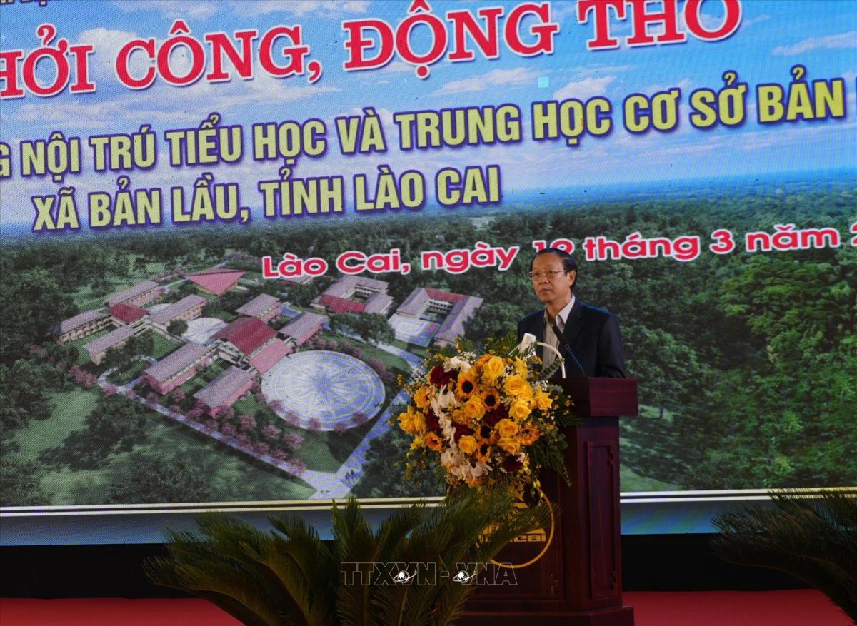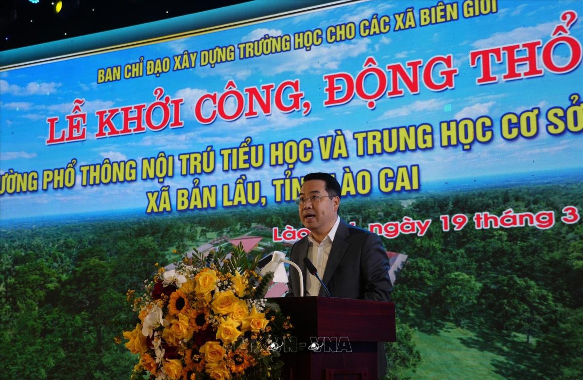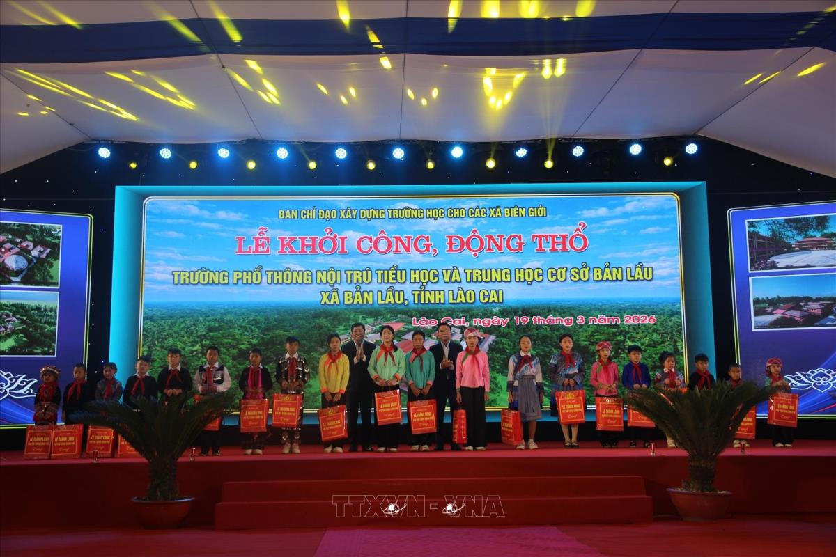 Lào Cai (TTXVN 19/3/2026) Sáng 19/3/2026, Phó Thủ tướng Lê Thành Long dự lễ khởi công, động thổ Trường phổ thông nội trú liên cấp tiểu học và trung học cở sở xã Bản Lầu. Công trình trên được đầu tư đồng bộ, đáp ứng nhu cầu cho 28 lớp nội trú, khoảng gần 1.000 học sinh, trong đó có 12 lớp Tiểu học, 16 lớp Trung học cơ sở.