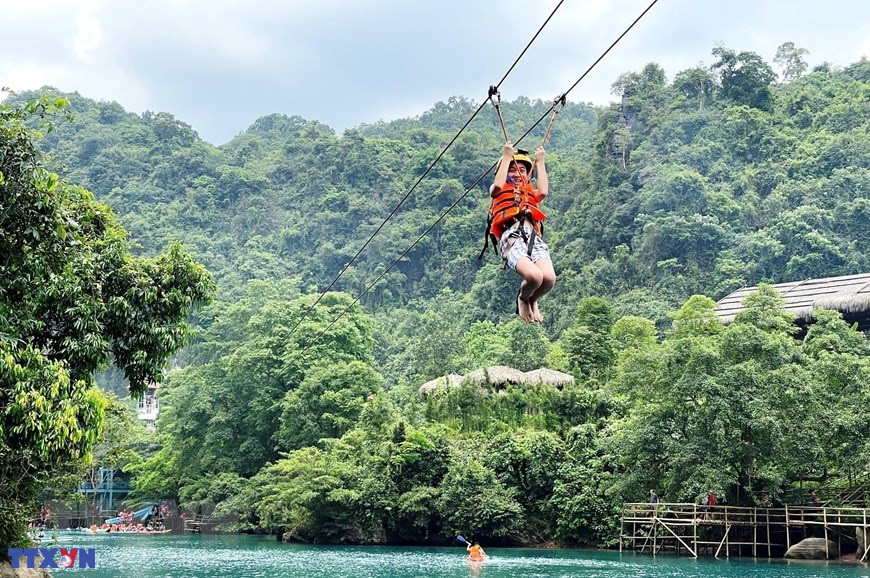 Du khách thích thú trải nghiệm nhiều trò chơi tại các điểm du lịch ở Phong Nha-Kẻ Bàng. (Ảnh: Võ Dung/TTXVN)
