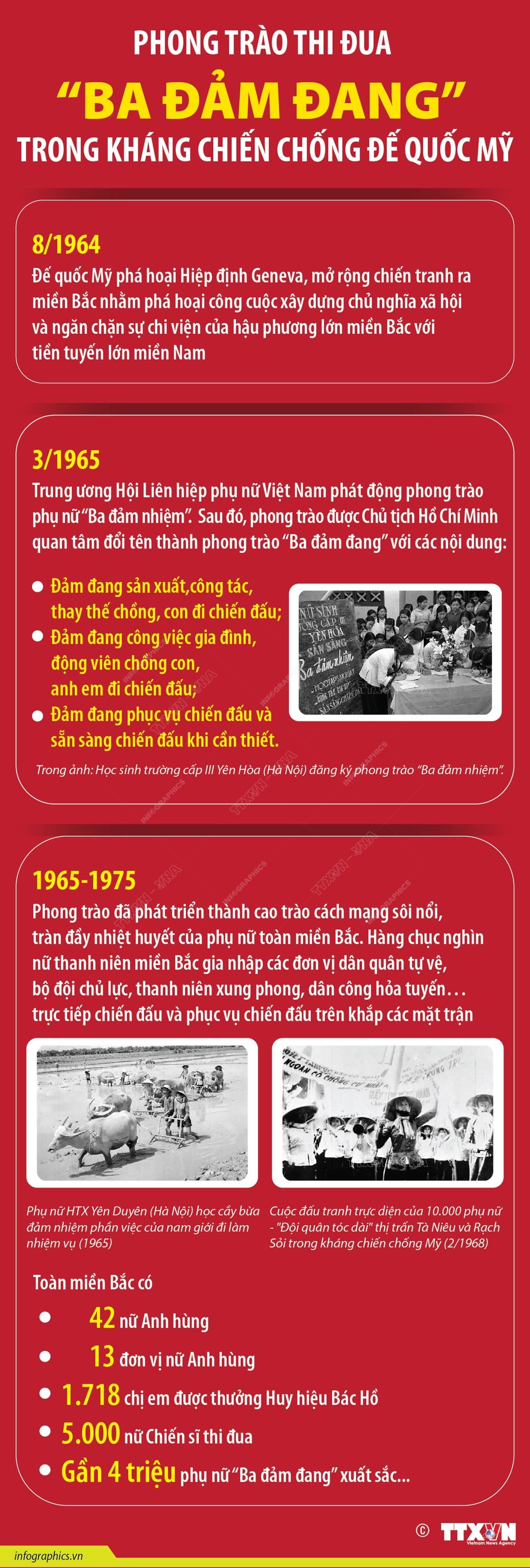 Tháng 3/1965, Trung ương Hội Liên hiệp phụ nữ Việt Nam phát động phong trào phụ nữ “Ba đảm nhiệm”, sau đó được Chủ tịch Hồ Chí Minh trực tiếp sửa tên thành phong trào “Ba đảm đang”: Đảm đang sản xuất, công tác, thay thế nam giới đi chiến đấu; Đảm đang gia đình, động viên chồng con, anh em đi chiến đấu; Đảm đang phục vụ chiến đấu và sẵn sàng chiến đấu khi cần thiết.