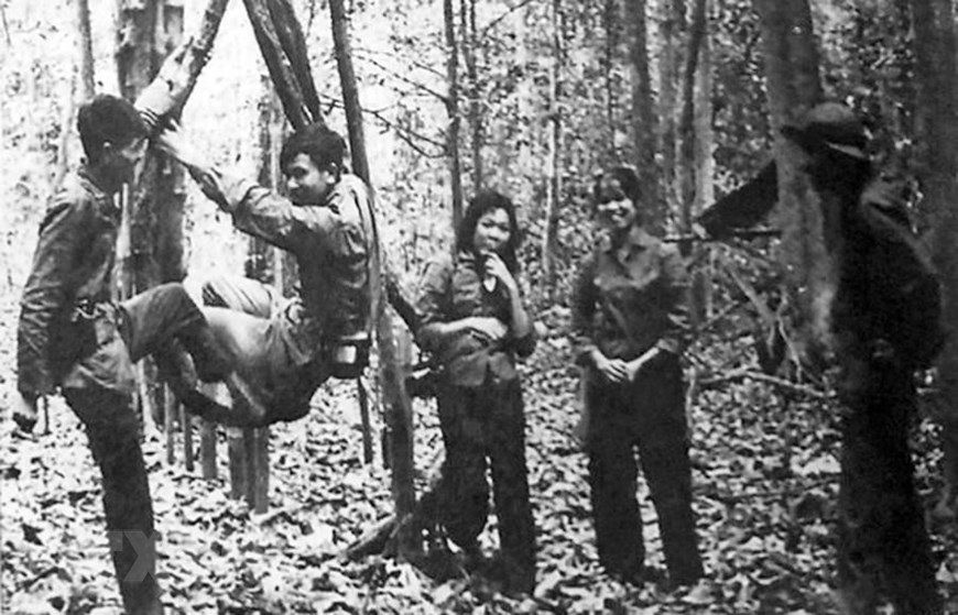Chặng dừng chân của đoàn phóng viên GP10 ctrên đường vào chiến trường miền Nam để chi viện cho Thông tấn xã Giải Phóng. (Ảnh: Tư liệu TTXVN)