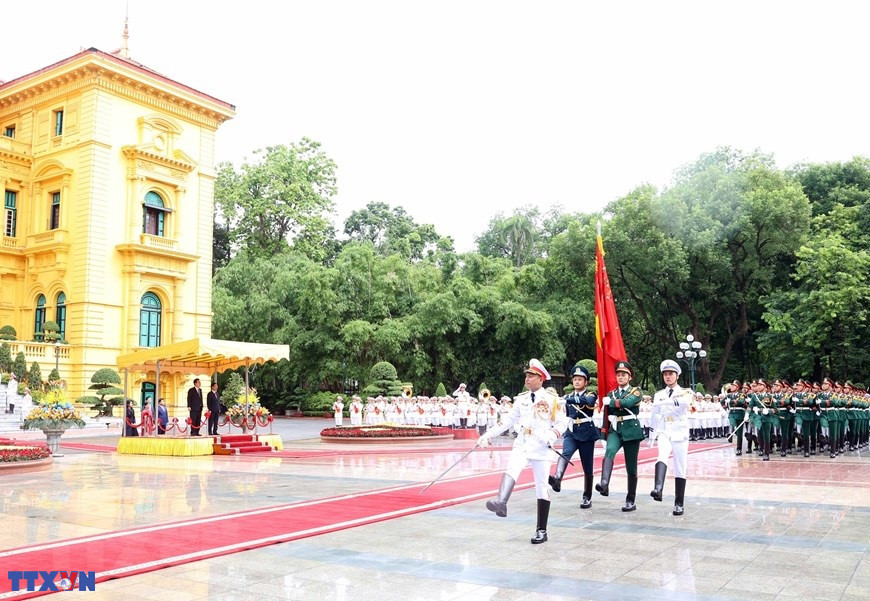 Hà Nội (TTXVN 23/6/2023) Sáng 23/6/2023, tại Phủ Chủ tịch, Chủ tịch nước Võ Văn Thưởng và Phu nhân chủ trì Lễ đón Tổng thống Hàn Quốc Yoon Suk Yeol và Phu nhân theo nghi thức cao nhất dành cho nguyên thủ quốc gia.
