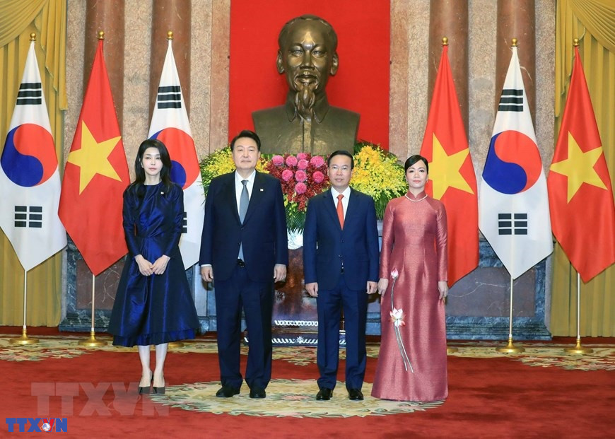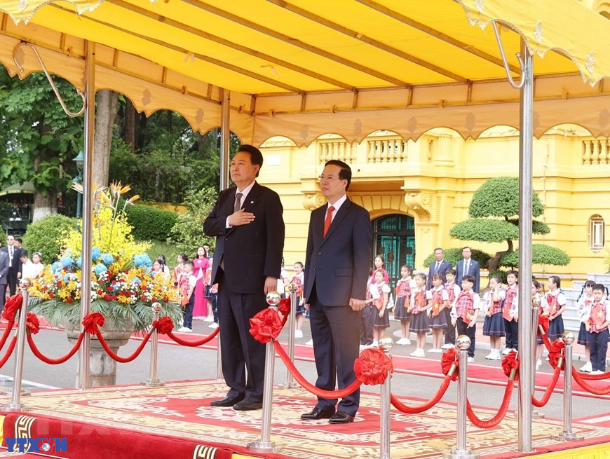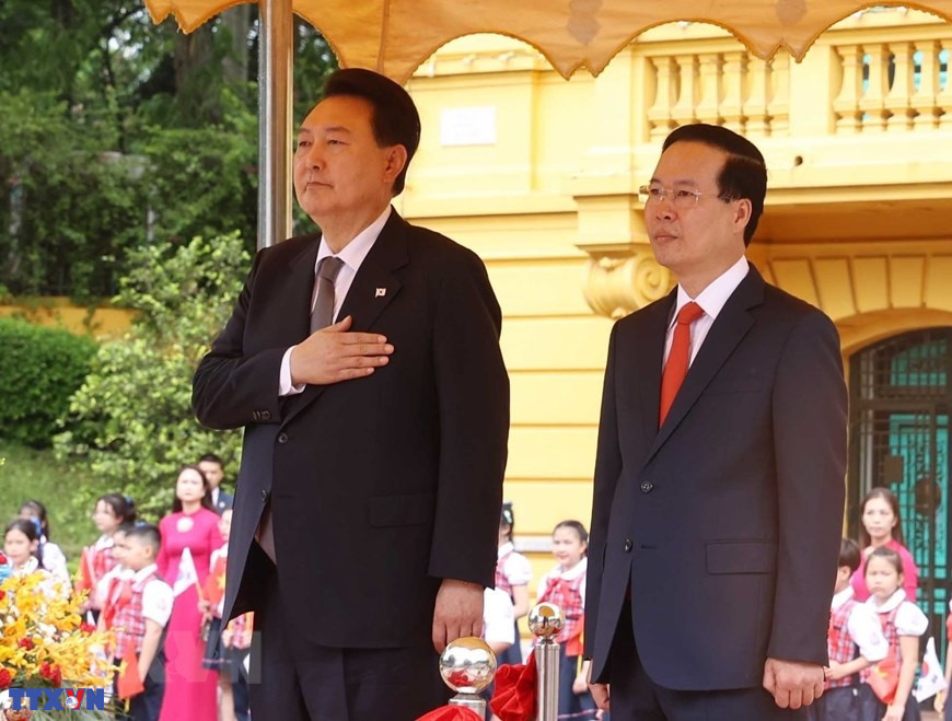 Chủ tịch nước Võ Văn Thưởng đón Tổng thống Hàn Quốc Yoon Suk Yeol. (Ảnh: Thống Nhất/TTXVN)