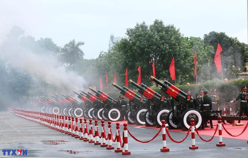 Lữ đoàn Pháo binh 45 (Binh chủng Pháo binh) bắn 21 phát đại bác chào mừng Tổng thống Hàn Quốc Yoon Suk Yeol và Phu nhân thăm cấp Nhà nước tới Việt Nam. (Ảnh: Lâm Khánh/TTXVN)