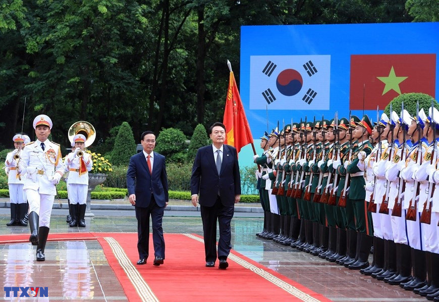 Chủ tịch nước Võ Văn Thưởng và Tổng thống Hàn Quốc Yoon Suk Yeol duyệt Đội Danh dự Quân đội Nhân dân Việt Nam. (Ảnh: Thống Nhất/TTXVN)
