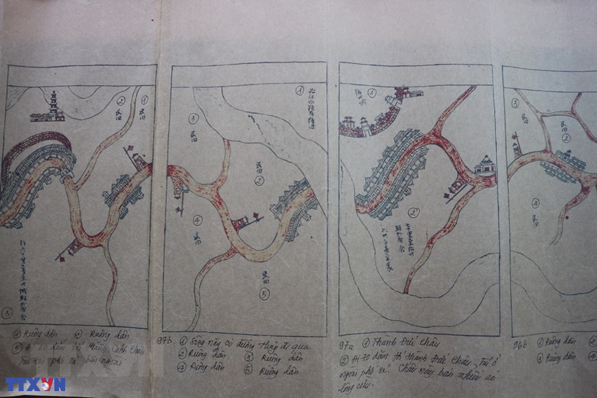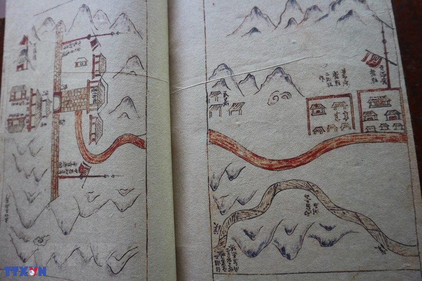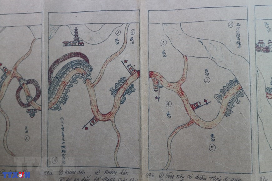 Cuốn sách với phần chính là bản đồ ghi chép bằng nhiều hình ảnh, thông tin phong phú, quý hiếm về hành trình đi sứ của Sứ bộ Đại Việt thế kỷ XVIII do Nguyễn Huy Oánh (1713-1789) biên tập, hiệu đính và chú thích trong các năm 1765-1768 từ các tài liệu của nhiều thế hệ đi sứ trước, đồng thời bổ sung thêm các chi tiết liên quan đến chuyến đi năm 1766-1767 do ông làm Chánh sứ. (Ảnh: Hoàng Ngà/TTXVN)