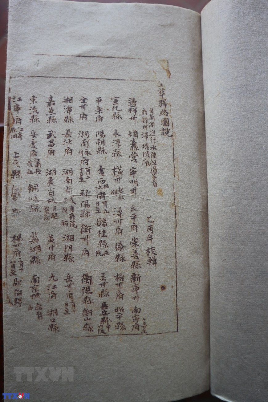 Một trang của phiên bản "Hoàng hoa sứ trình đồ" được con cháu dòng họ Nguyễn Huy ở Hà Tĩnh lưu giữ lại. (Ảnh: Hoàng Ngà/TTXVN)