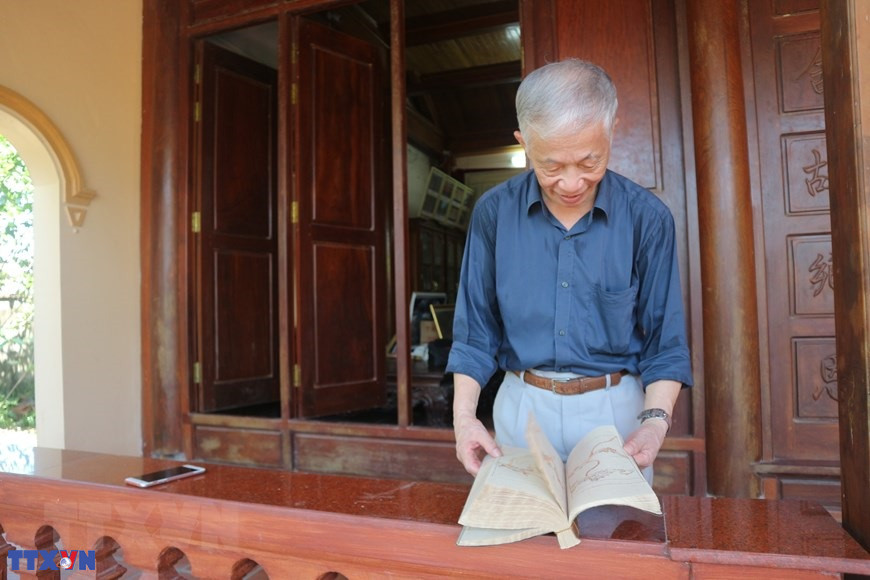 Giáo sư, Viện sỹ Nguyễn Huy Mỹ, Giáo sư-Viện sỹ Nguyễn Huy Mỹ, hậu duệ đời thứ 16 của dòng họ Nguyễn Huy ở Hà Tĩnh là người có nhiều công lao trong việc gìn giữ, quảng bá Hoàng hoa sứ trình đồ ra thế giới. (Ảnh: Hoàng Ngà/TTXVN)