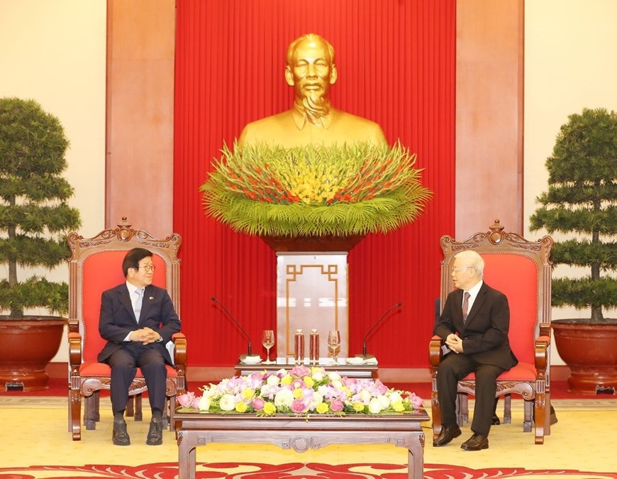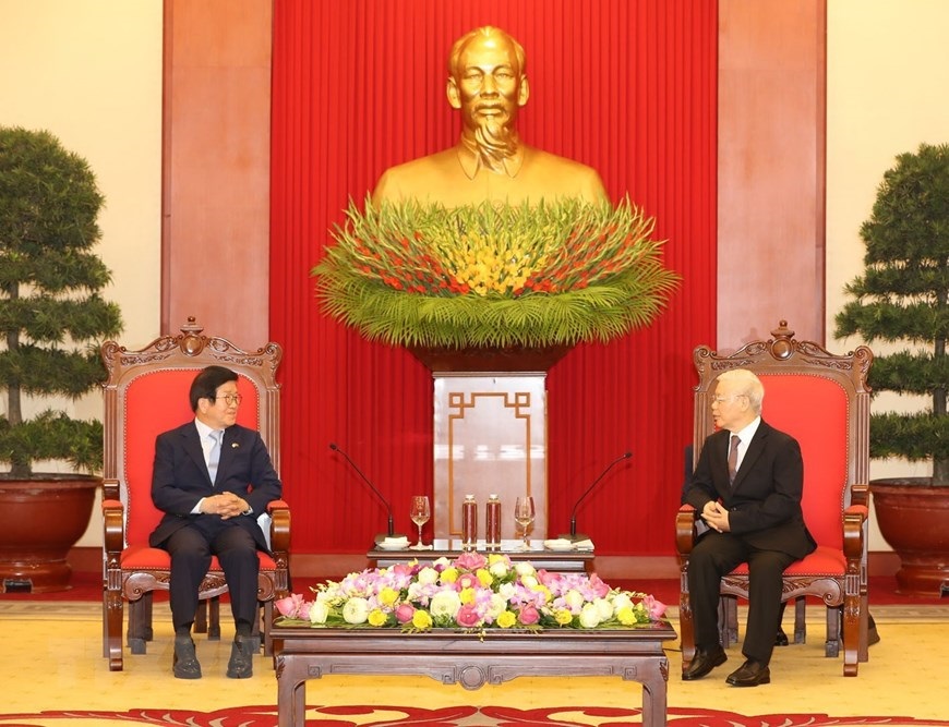 Tổng Bí thư, Chủ tịch nước Nguyễn Phú Trọng tiếp Chủ tịch Quốc hội Hàn Quốc Park Byeong-Seug. (Ảnh: Trí Dũng/TTXVN)