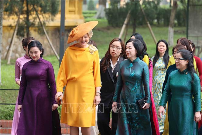 Trong tiết trời nắng nhẹ, se lạnh của Thủ đô Hà Nội, Phu nhân Nguyễn Thị Minh Nguyệt và Hoàng hậu Mathilde đã đi bộ từ Phủ Chủ tịch sang Khu Di tích Chủ tịch Hồ Chí Minh.