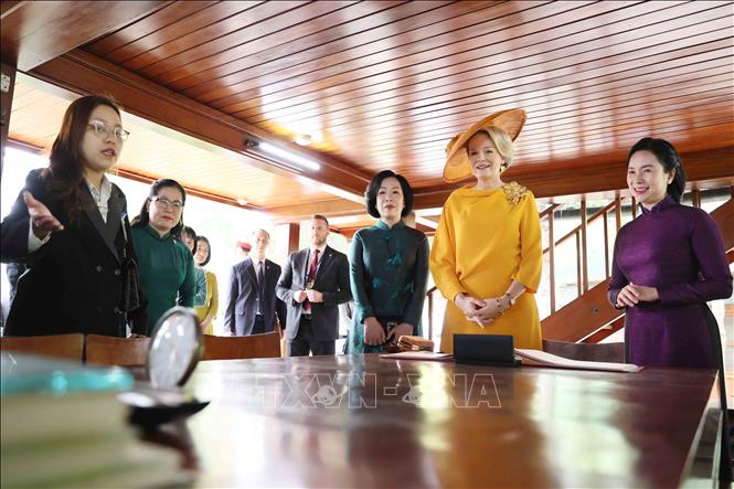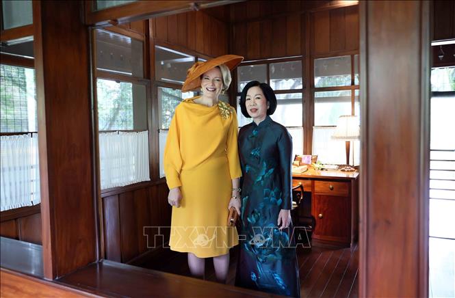 Hà Nội (TTXVN 1/4/2025) Sáng 1/4, trong khuôn khổ chuyến thăm cấp Nhà nước đến Việt Nam của Nhà Vua Philippe và Hoàng hậu Mathilde của Vương quốc Bỉ, bà Nguyễn Thị Minh Nguyệt, Phu nhân Chủ tịch nước Lương Cường và Hoàng hậu Vương quốc Bỉ Mathilde đã thăm Khu Di tích Chủ tịch Hồ Chí Minh tại Phủ Chủ tịch.