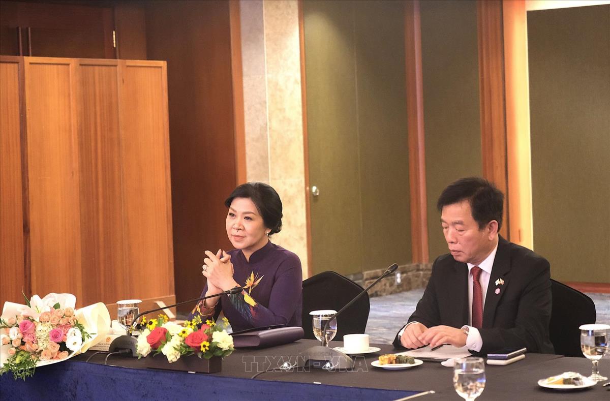 Phu nhân Ngô Phương Ly và Đại sứ Việt Nam tại Hàn Quốc - Vũ Hồ tại cuộc gặp (11/8/2025). Ảnh: Khánh Vân - PV TTXVN tại Hàn Quốc