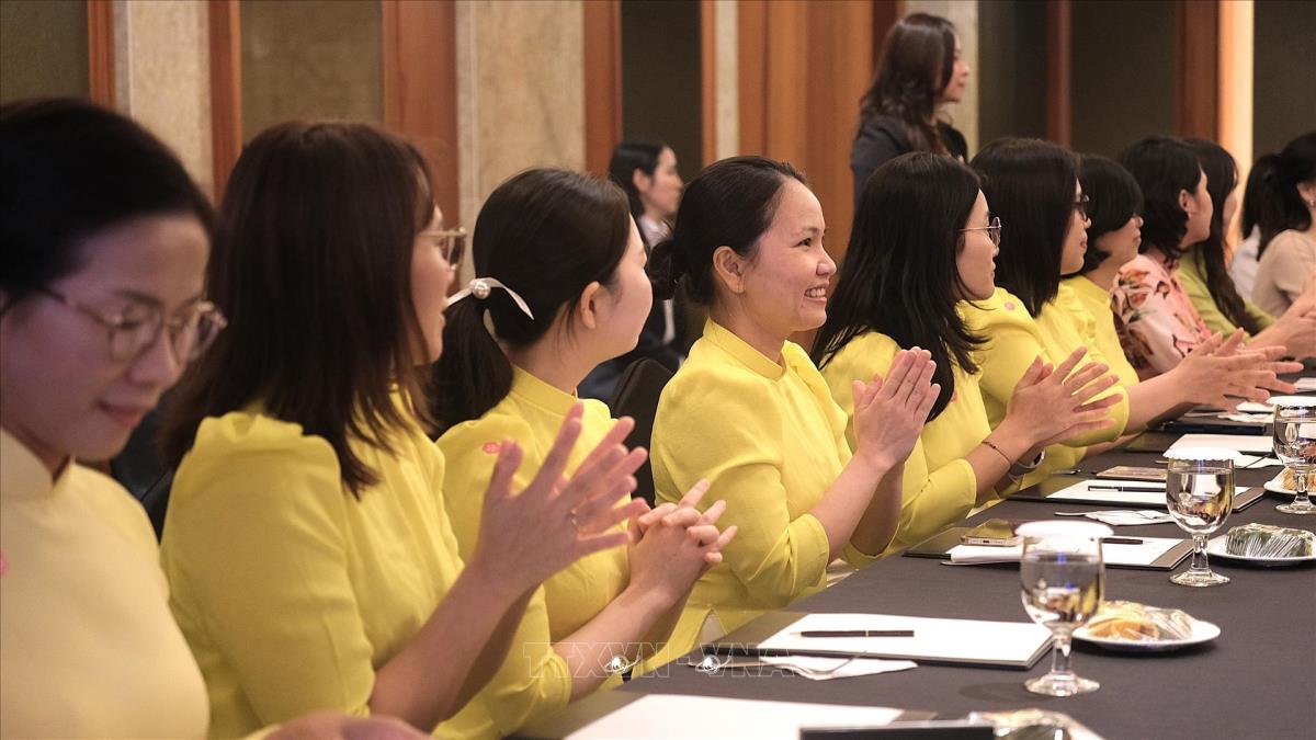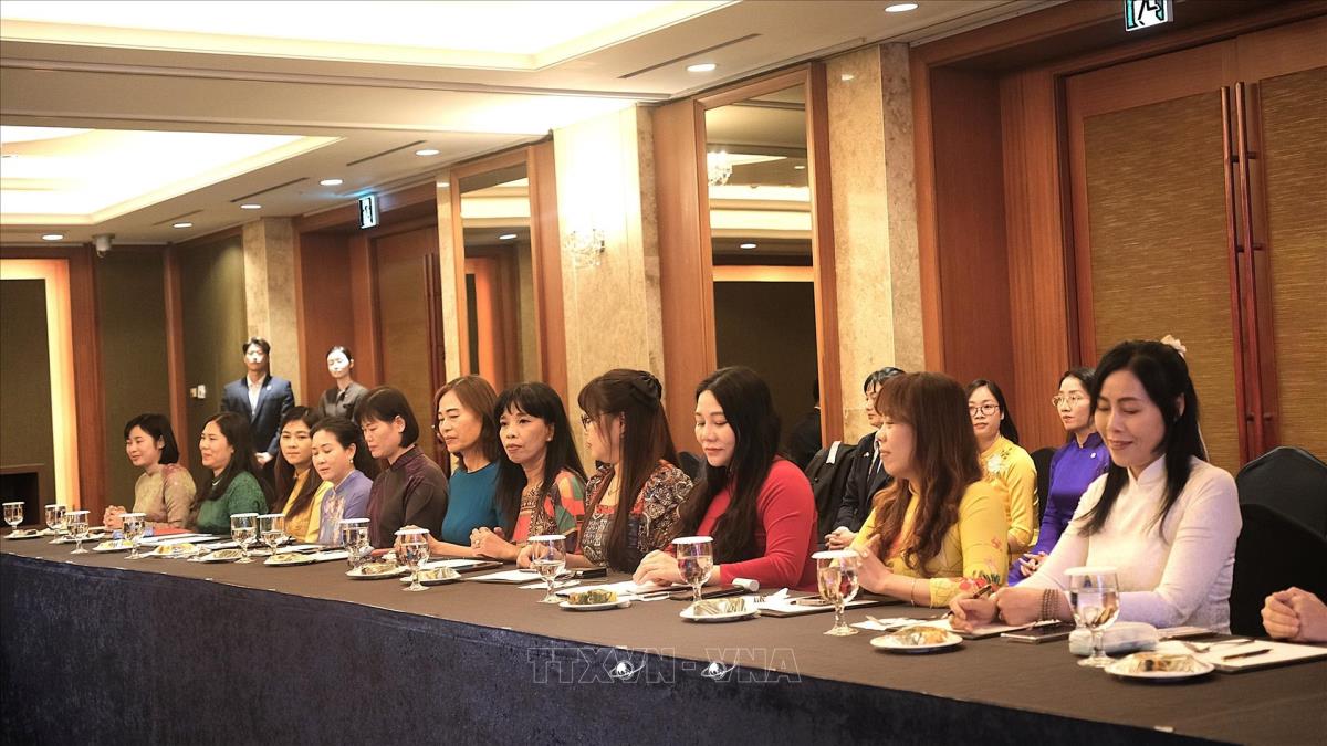 Các cô dâu Việt Nam tham gia cuộc gặp Phu nhân Tổng Bí thư (11/8/2025). Ảnh: Khánh Vân - PV TTXVN tại Hàn Quốc