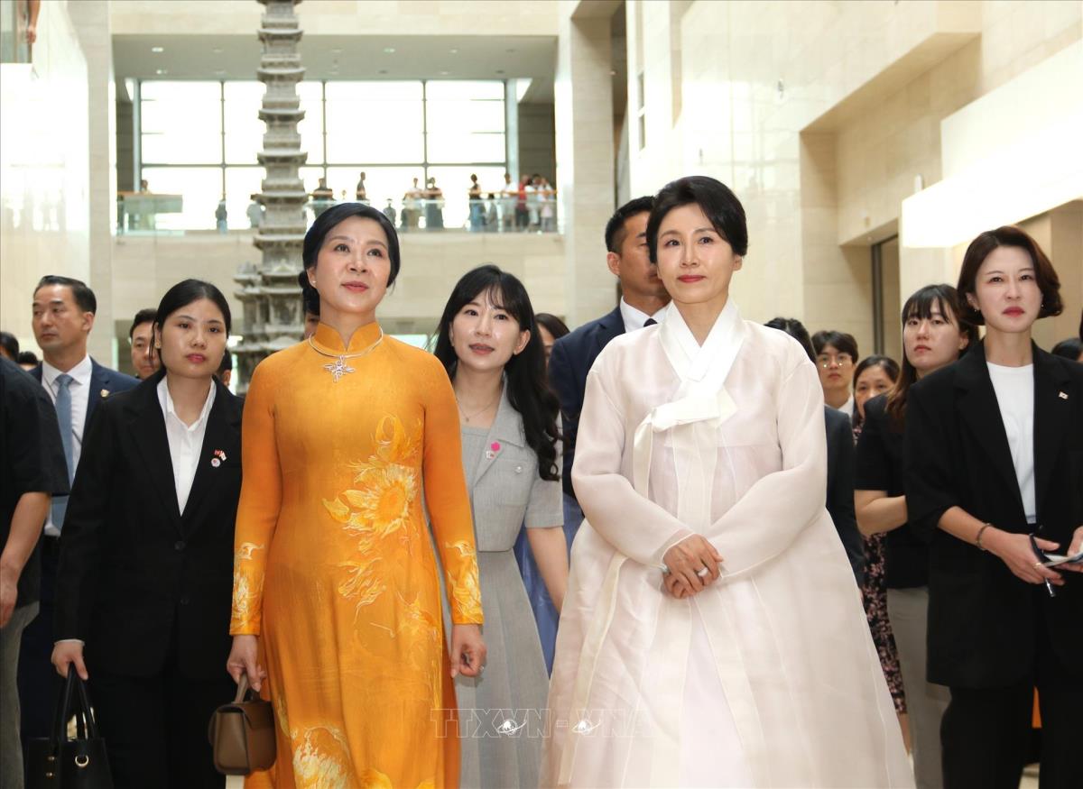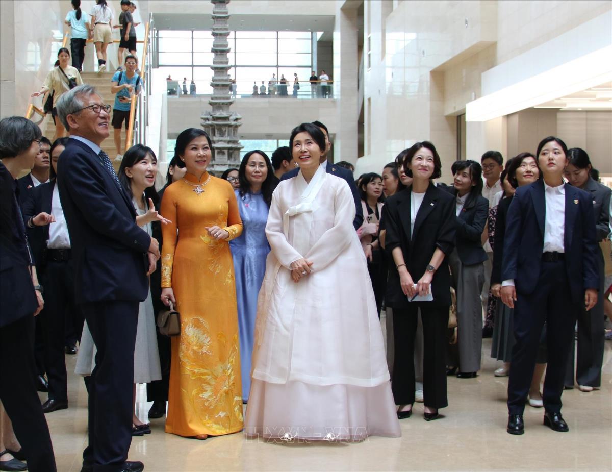 Phu nhân Ngô Phương Ly cùng bà Kim Hye Kyung, Phu nhân Tổng thống Hàn Quốc tham quan Bảo tàng Quốc gia Hàn Quốc (11/8/2025). Ảnh: Đức Thắng/TTXVN