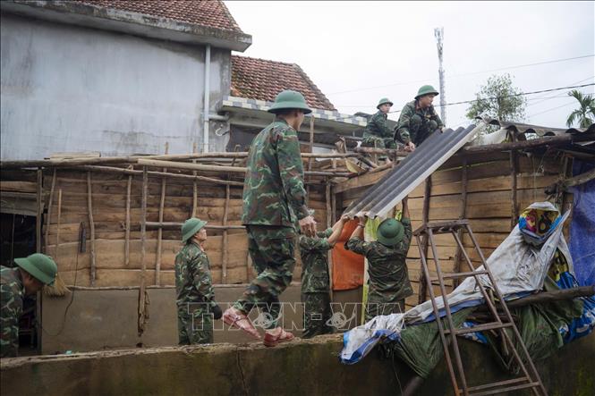 Lực lượng bộ đội ra quân giúp dân xây dựng và sửa chữa nhà cửa bị ảnh hưởng bởi mưa lũ tại xã Lộc An, TP Huế. Ảnh: Mai Trang/TTXVN