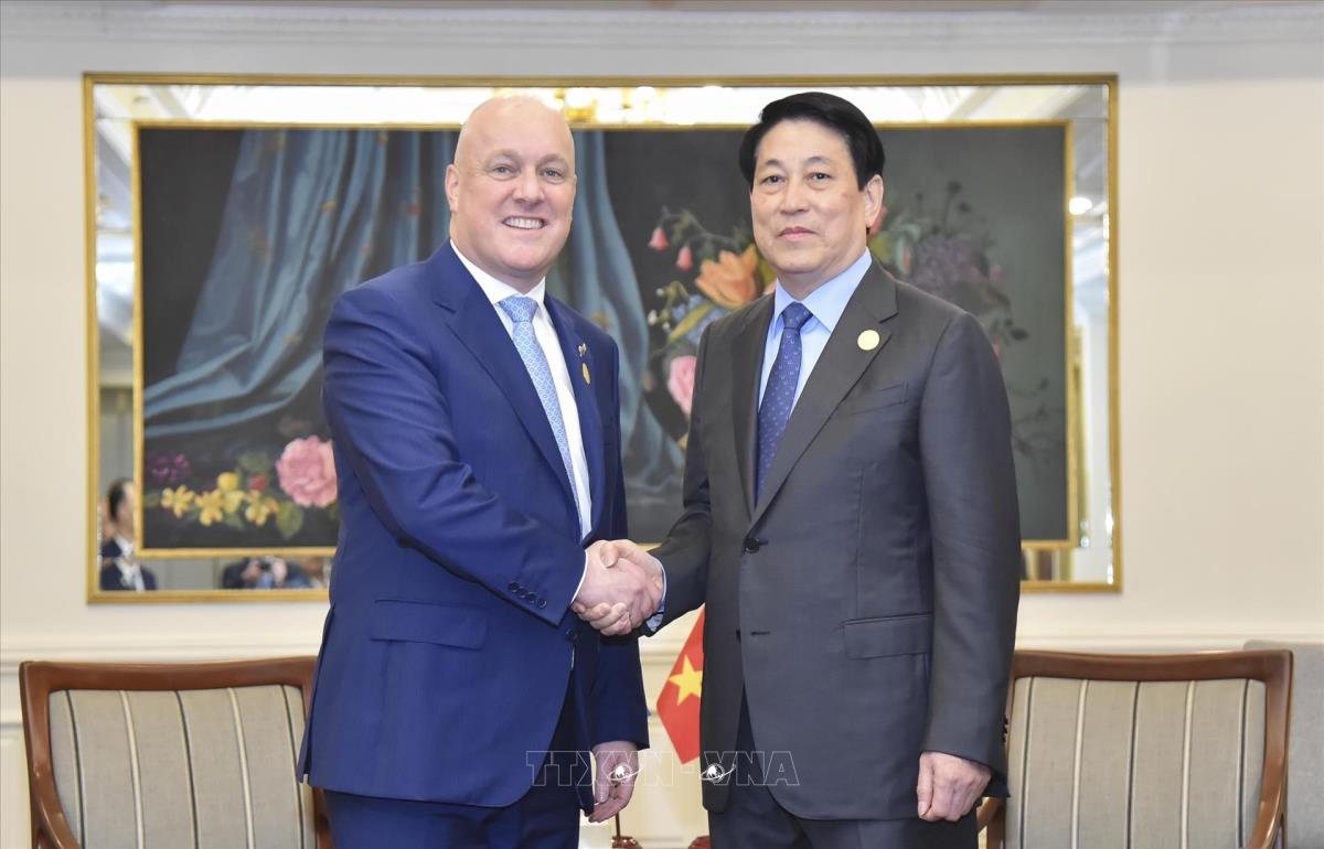 Chủ tịch nước Lương Cường gặp Thủ tướng New Zealand Christopher Luxon (chiều 15/11/2024, giờ địa phương). Ảnh: Lâm Khánh – TTXVN
