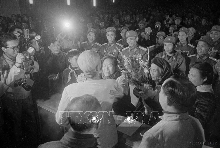 Tại Đại hội anh hùng chiến sĩ thi đua lần thứ IV, Chủ tịch Hồ Chí Minh nói chuyện thân mật và chúc mừng cụ Nguyễn Thị Suốt, quê ở Quảng Bình được tuyên dương Anh hùng ngành giao thông vận tải. Ảnh: TTXVN