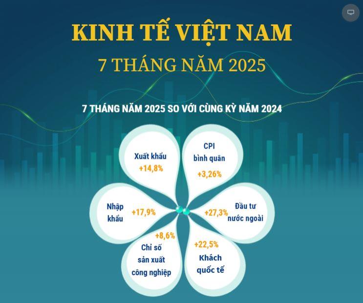 Kinh tế-xã hội cả nước tháng 7 và 7 tháng năm 2025 được Cục Thống kê, Bộ Tài chính công bố, ghi nhận nhiều tín hiệu tích cực, tiếp đà tăng trưởng ở nhiều lĩnh vực như: sản xuất công nghiệp, thương mại đầu tư, thu hút FDI và kim ngạch xuất khẩu tăng mạnh, đầu tư công bứt phá, lạm phát trong tầm kiểm soát...