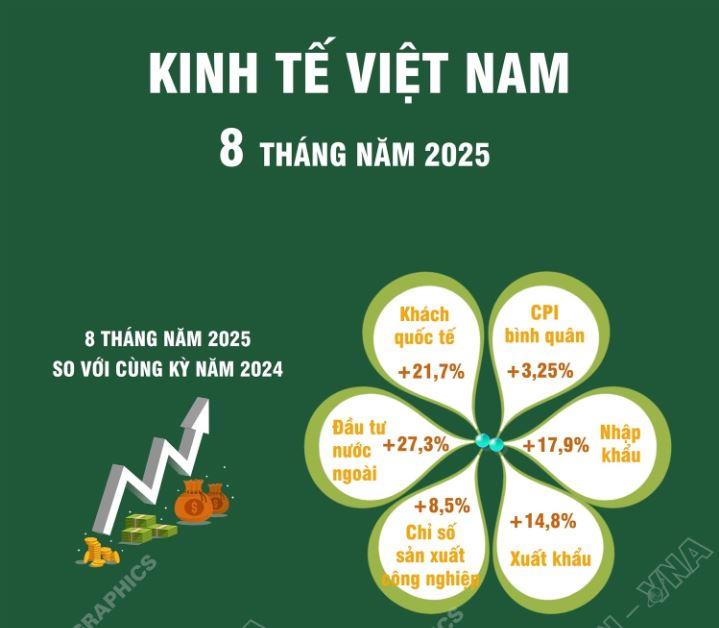 Tình hình kinh tế-xã hội 8 tháng năm 2025, được Cục Thống kê, Bộ Tài chính công bố cho thấy kinh tế-xã hội cả nước 8 tháng có nhiều tín hiệu tích cực.