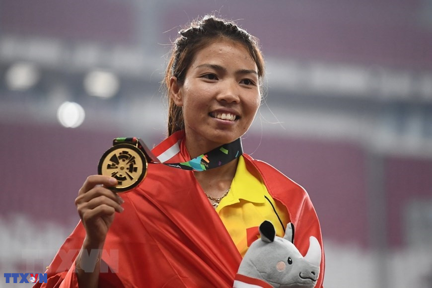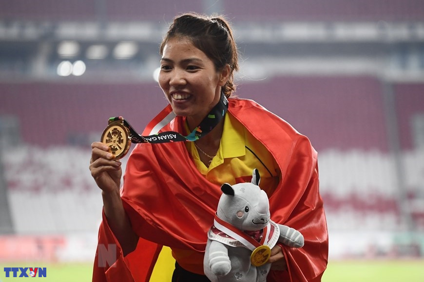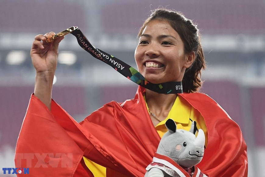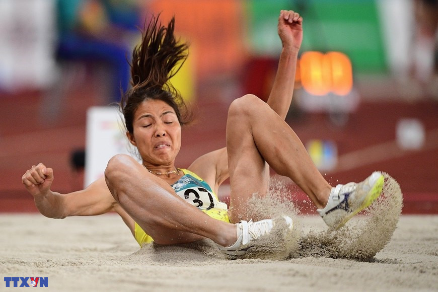 Vận động viên Bùi Thị Thu Thảo (giữa) của Việt Nam giành Huy chương Vàng, Neena Varakil (trái) của Ấn Độ giành Huy chương Bạc và Xu Xiaoling của Trung Quốc giành Huy chương Đồng nội dung nhảy xa nữ tại ASIAD 2018, Jakarta, Indonesia ngày 27/8. (Ảnh: TTXVN phát)