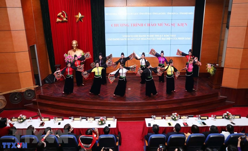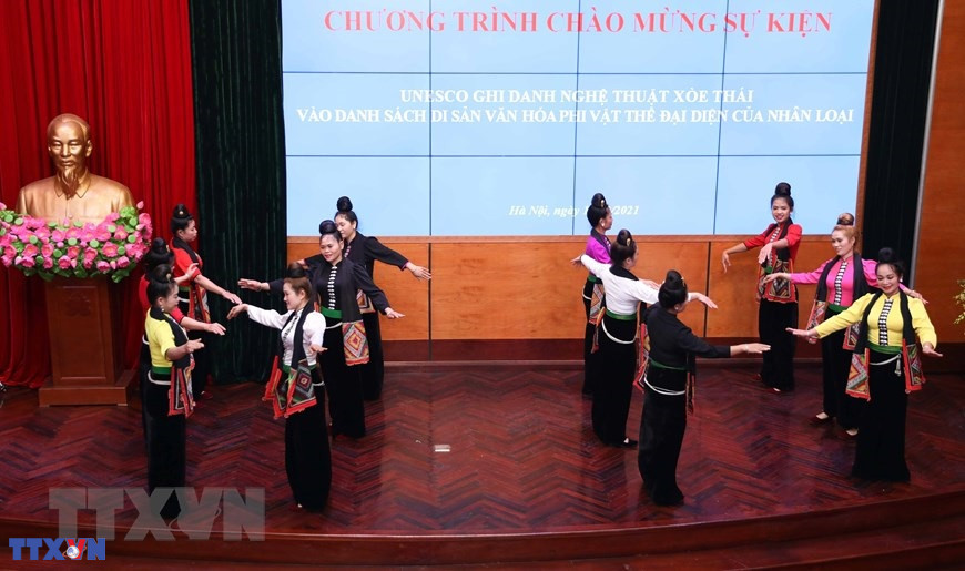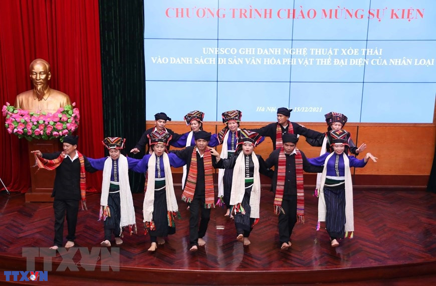 Hà Nội (TTXVN 15/12/2021) Ngày 15/12/2021, Tổ chức Giáo dục, Khoa học và Văn hóa Liên hợp quốc (UNESCO) đã chính thức ghi danh Xòe Thái là Di sản Văn hóa Phi vật thể Đại diện của Nhân loại. Ngày 15/12, Tổ chức Giáo dục, Khoa học và Văn hóa Liên hợp quốc (UNESCO) đã chính thức ghi danh Xòe Thái là Di sản Văn hóa Phi vật thể Đại diện của Nhân loại. (Ảnh: Thanh Tùng/TTXVN)Giây phút Nghệ thuật Xòe Thái của Việt Nam chính thức được UNESCO ghi danh vào Danh sách Di sản Văn hóa Phi vật thể Đại diện của Nhân loại tại đầu cầu Bộ Văn hóa, Thể thao và Du lịch tại Hà Nội. (Ảnh: Thanh Tùng/TTXVN)Theo dõi phiên họp tại đầu cầu Bộ Văn hóa, Thể thao và Du lịch tại Hà Nội. (Ảnh: Thanh Tùng/TTXVN)Theo dõi phiên họp tại đầu cầu Bộ Văn hóa, Thể thao và Du lịch tại Hà Nội. (Ảnh: Thanh Tùng/TTXVN)Giây phút Nghệ thuật Xòe Thái của Việt Nam chính thức được UNESCO ghi danh vào Danh sách Di sản Văn hóa Phi vật thể Đại diện của Nhân loại tại đầu cầu Bộ Văn hóa, Thể thao và Du lịch tại Hà Nội. (Ảnh: Thanh Tùng/TTXVN)Giây phút Nghệ thuật Xòe Thái của Việt Nam chính thức được UNESCO ghi danh vào Danh sách Di sản Văn hóa Phi vật thể Đại diện của Nhân loại tại đầu cầu Bộ Văn hóa, Thể thao và Du lịch tại Hà Nội. (Ảnh: Thanh Tùng/TTXVN)Giây phút Nghệ thuật Xòe Thái của Việt Nam chính thức được UNESCO ghi danh vào Danh sách Di sản Văn hóa Phi vật thể Đại diện của Nhân loại tại đầu cầu Bộ Văn hóa, Thể thao và Du lịch tại Hà Nội. (Ảnh: Thanh Tùng/TTXVN)Theo dõi phiên họp tại đầu cầu Bộ Văn hóa, Thể thao và Du lịch tại Hà Nội. (Ảnh: Thanh Tùng/TTXVN)Thứ trưởng Bộ Văn hóa Thể thao và Du lịch Hoàng Đạo Cương trả lời phỏng vấn các cơ quan thông tấn, báo chí ngay sau khi Nghệ thuật Xòe Thái của Việt Nam chính thức được UNESCO ghi danh. (Ảnh: Thanh Tùng/TTXVN)Trong tiếng Thái, “Xòe” có nghĩa là múa với các động tác tượng trưng cho các hoạt động của con người trong nghi lễ, sinh hoạt văn hóa, cuộc sống, lao động. (Ảnh: Thanh Tùng/TTXVN)Xòe được trình diễn trong các nghi lễ, trong đám cưới, lễ hội, các sự kiện văn hóa của cộng đồng. (Ảnh: Thanh Tùng/TTXVN)Chủ thể của Nghệ thuật Xòe Thái là cộng đồng người Thái, cư trú ở vùng núi Tây Bắc Việt Nam. Họ là một trong 54 dân tộc sinh sống ở Việt Nam, chủ yếu canh tác trồng lúa nước. (Ảnh: Thanh Tùng/TTXVN)Những người thực hành Xòe là thành viên của cộng đồng người Thái, không phân biệt giới tính, lứa tuổi, nghề nghiệp và địa vị xã hội. (Ảnh: Thanh Tùng/TTXVN)Xòe được bà con người Thái thực hành ở 4 tỉnh Yên Bái, Lai Châu, Sơn La và Điện Biên. (Ảnh: Thanh Tùng/TTXVN)Ngày nay, nghệ thuật xòe Thái đã trở thành biểu tượng của lòng hiếu khách, dấu ấn văn hóa tộc người, bản sắc văn hóa của người Thái vùng Tây Bắc Việt Nam...(Ảnh: Thanh Tùng/TTXVN)Nghệ thuật xòe Thái tượng trưng cho cái đẹp, chứa đựng các giá trị nghệ thuật vũ đạo, âm nhạc, ca hát, trang phục, ẩm thực và ứng xử văn hóa của cộng đồng người Thái.(Ảnh: Thanh Tùng/TTXVN)Biểu diễn các điệu Xòe Thái mừng sự kiện UNESCO ghi danh Xòe Thái vào Danh sách Di sản Văn hóa Phi vật thể Đại diện của Nhân loại tại Bộ Văn hóa, Thể thao và Du lịch. (Ảnh: Thanh Tùng/TTXVN)
