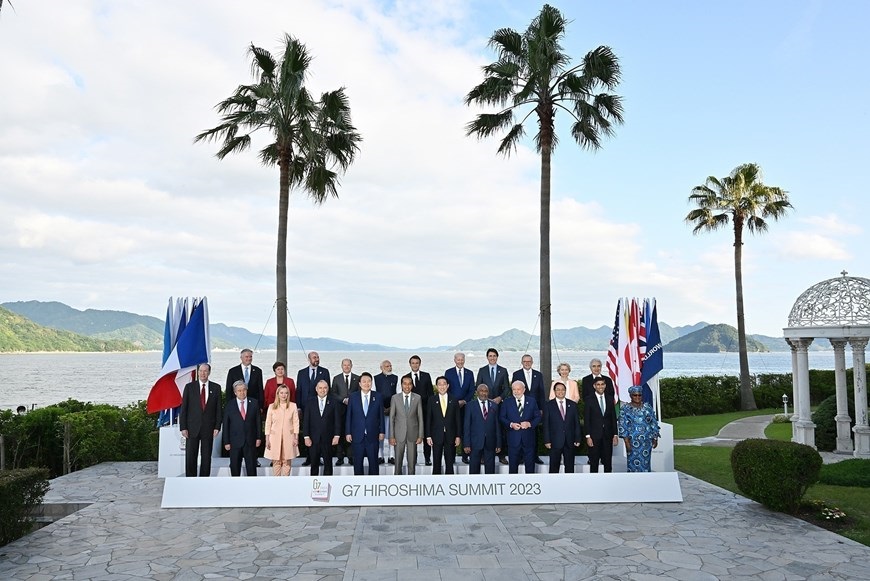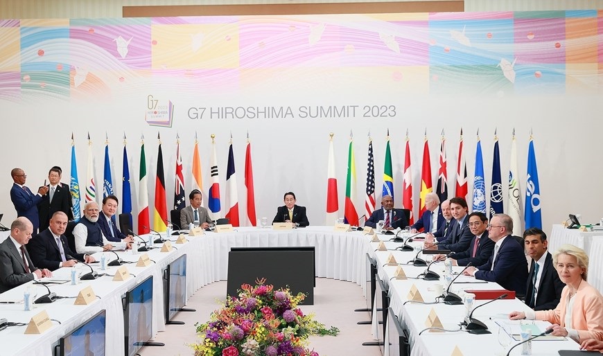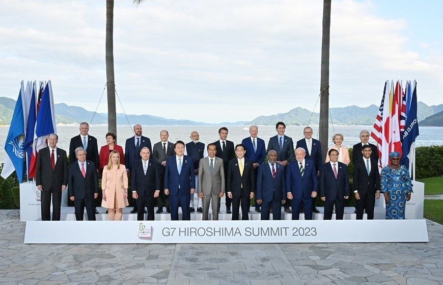 Hà Nội (TTXVN 20/5/2023) Chiều 20/5/2023, tại Hiroshima, Nhật Bản, Thủ tướng Nhật Bản Kishida Fumio đón Thủ tướng Phạm Minh Chính và Trưởng đoàn các nước tham dự Hội nghị thượng đỉnh Nhóm G7 mở rộng. Thủ tướng Nhật Bản Kishida Fumio và Phu nhân đón Thủ tướng Phạm Minh Chính tham dự Hội nghị thượng đỉnh Nhóm các nước công nghiệp phát triển (G7) mở rộng. (Ảnh: Dương Giang/TTXVN)Thủ tướng Nhật Bản Kishida Fumio và Phu nhân đón Thủ tướng Phạm Minh Chính tham dự Hội nghị thượng đỉnh Nhóm các nước công nghiệp phát triển (G7) mở rộng. (Ảnh: Dương Giang/TTXVN)Chiều 20/5/2023, tại Hiroshima, Nhật Bản, Thủ tướng Phạm Minh Chính và Trưởng đoàn Nhóm các nước công nghiệp phát triển (G7) mở rộng tham dự phiên thảo luận Cùng hợp tác giải quyết đa khủng hoảng. (Ảnh: Dương Giang/TTXVN)Quang cảnh phiên thảo luận Cùng hợp tác giải quyết đa khủng hoảng. (Ảnh: Dương Giang/TTXVN)Hình ảnh Thủ tướng Phạm Minh Chính và Trưởng đoàn Nhóm các nước công nghiệp phát triển (G7) mở rộng tham dự phiên thảo luận Cùng hợp tác giải quyết đa khủng hoảng. (Ảnh: Dương Giang/TTXVN)Thủ tướng Phạm Minh Chính và các trưởng đoàn chụp ảnh chung. (Ảnh: Dương Giang/TTXVN)Hình ảnh Thủ tướng Phạm Minh Chính và các trưởng đoàn chụp ảnh chung. (Ảnh: Dương Giang/TTXVN)
