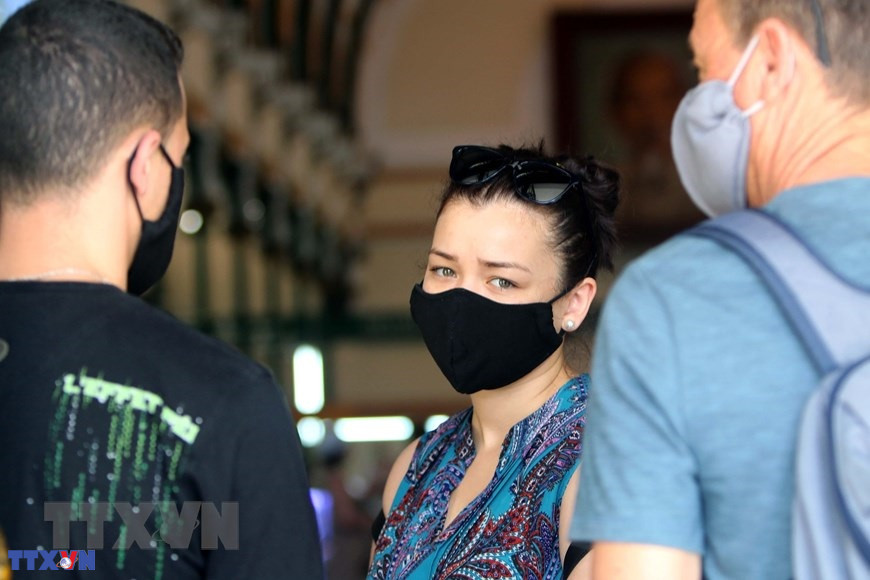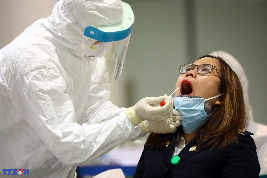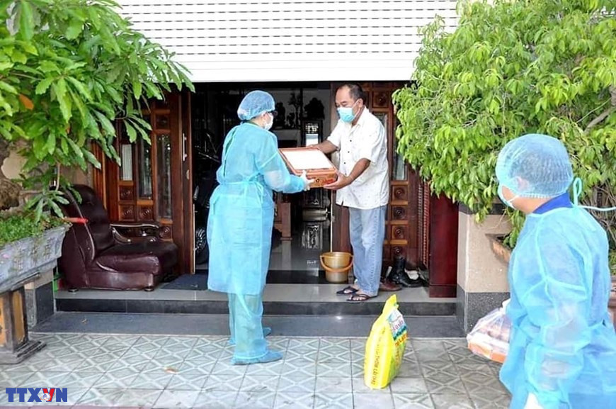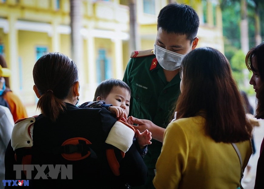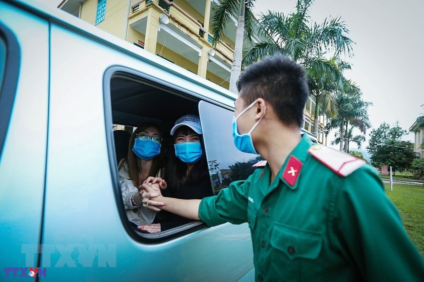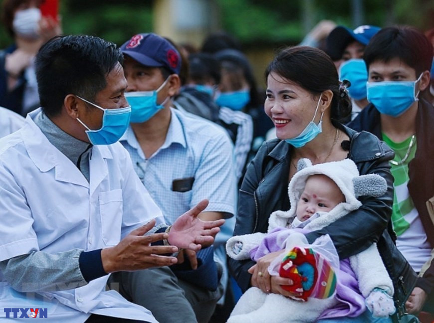 Các bác sỹ, cán bộ y tế tỉnh Hòa Bình ân cần thăm hỏi sức khỏe hai bà cháu Chị Nguyễn Thị Oanh (là công dân tình nguyện vào chăm sóc cho cháu nội 4 tháng tuổi Lưu Hà My được bố mẹ gửi về từ Hàn Quốc) trong ngày chia tay, trao giấy chứng nhận hoàn thành thời gian cách ly phòng, chống dịch COVID-19. (Nguồn: TTXVN)