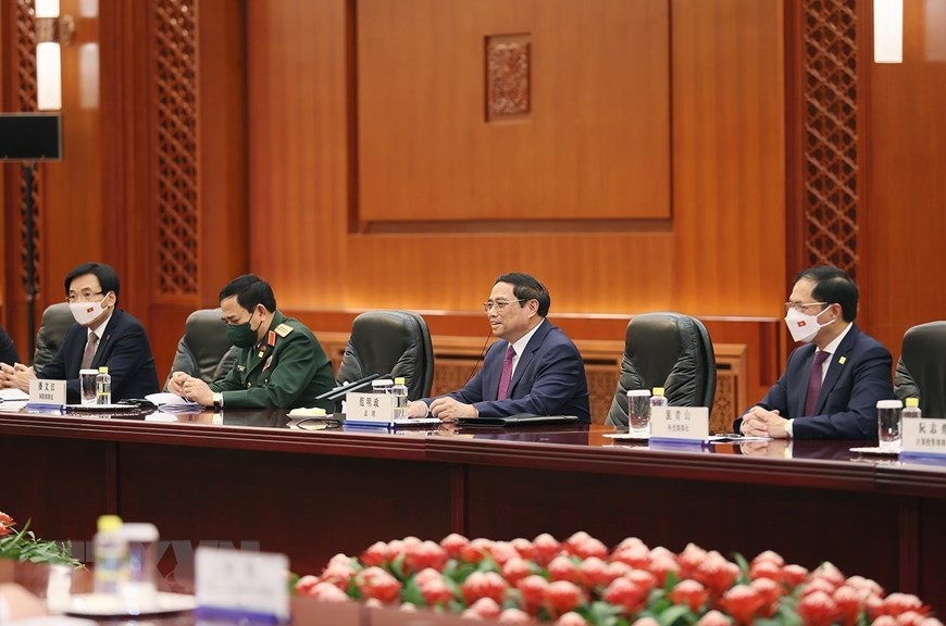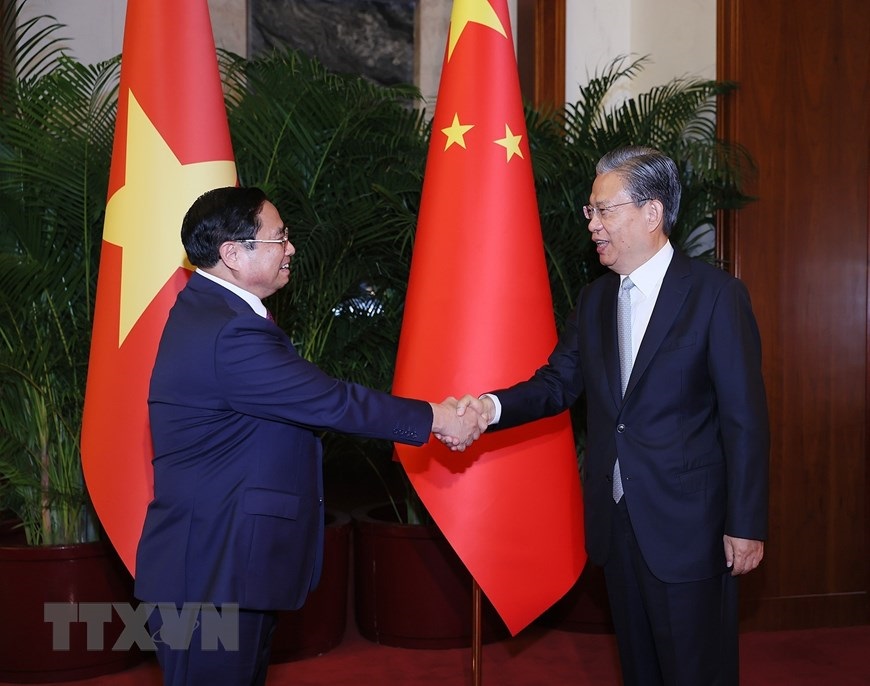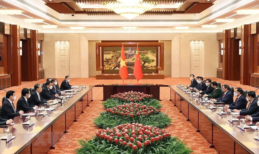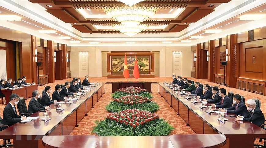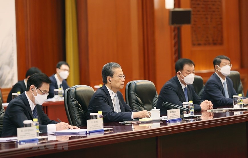 Ủy viên trưởng Triệu Lạc Tế đánh giá cao và bày tỏ đồng tình với những đề xuất của Thủ tướng Phạm Minh Chính về phát triển quan hệ hai Đảng, hai nước. Nhấn mạnh Trung Quốc và Việt Nam là hai nước láng giềng hữu nghị, xã hội chủ nghĩa, đều gánh vác sứ mệnh lịch sử mang lại hạnh phúc cho nhân dân, phát triển cho đất nước. (Ảnh: Dương Giang/TTXVN)