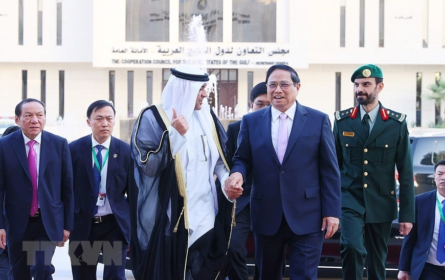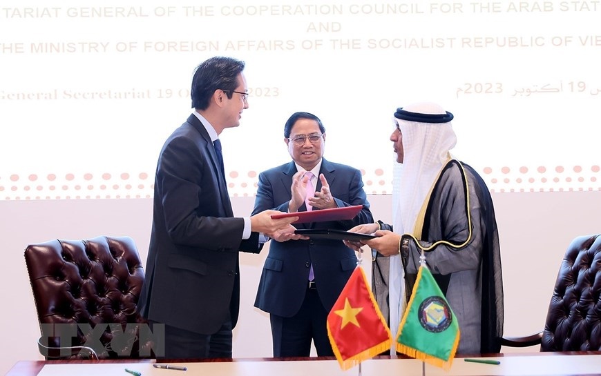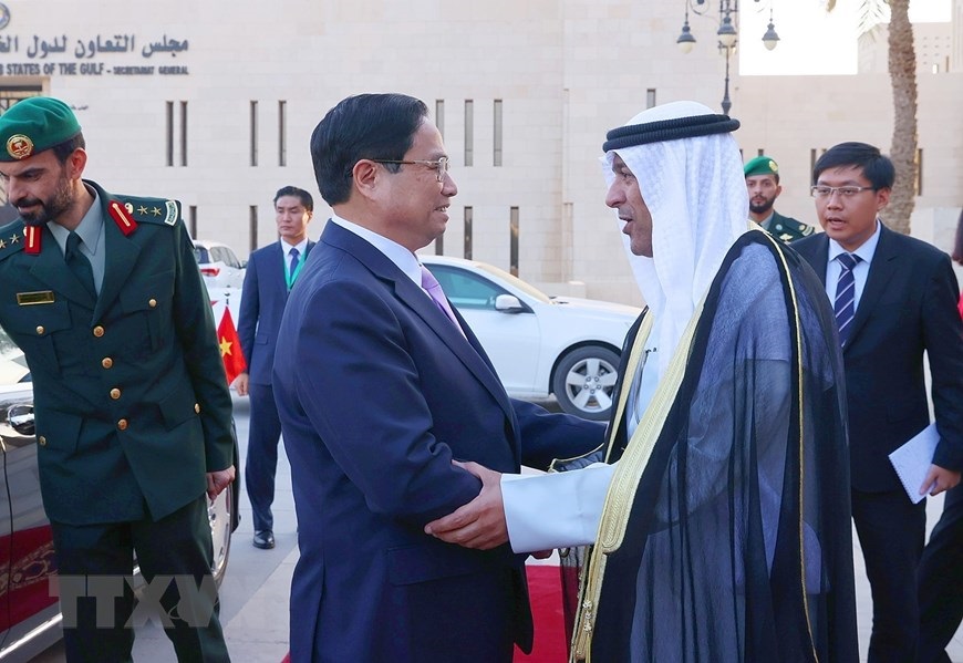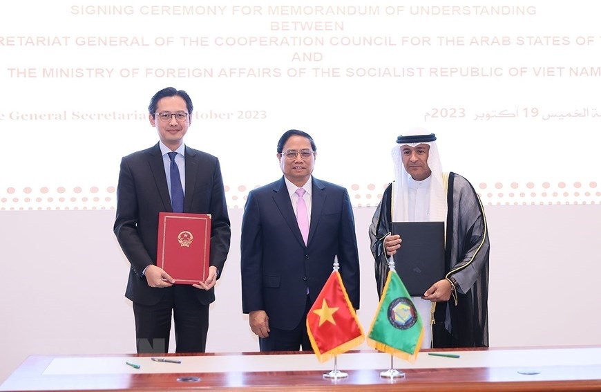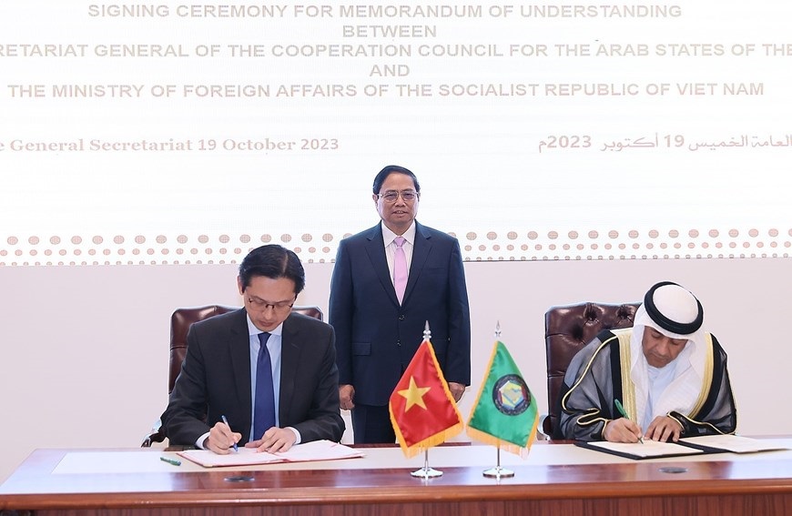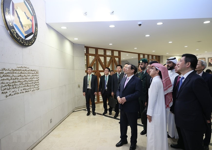 Hà Nội (TTXVN 20/10/2023) Chiều 19/10/2023, tại thành phố Riyadh (Saudi Arabia), Thủ tướng Phạm Minh Chính đến thăm Trụ sở Hội đồng Hợp tác Vùng Vịnh (GCC) và làm việc với Tổng Thư ký GCC. Chiều 19/10/2023, tại thành phố Riyadh (Saudi Arabia), Thủ tướng Phạm Minh Chính đến thăm Trụ sở Hội đồng Hợp tác Vùng Vịnh (GCC) và làm việc với Tổng Thư ký GCC. (Ảnh: Dương Giang/TTXVN)Tổng Thư ký GCC Jassim Muhammad Al-Budaiwi đón Thủ tướng Phạm Minh Chính. (Ảnh: Dương Giang/TTXVN)Tổng Thư ký GCC Jassim Muhammad Al-Budaiwi đón Thủ tướng Phạm Minh Chính. (Ảnh: Dương Giang/TTXVN)Thủ tướng Phạm Minh Chính xem trưng bày ảnh và hiện vật lịch sử các nước vùng Vịnh. (Ảnh: Dương Giang/TTXVN)Thủ tướng Phạm Minh Chính xem trưng bày ảnh và hiện vật lịch sử các nước vùng Vịnh. (Ảnh: Dương Giang/TTXVN)Thủ tướng Phạm Minh Chính xem trưng bày ảnh và hiện vật lịch sử các nước vùng Vịnh. (Ảnh: Dương Giang/TTXVN)Thủ tướng Phạm Minh Chính làm việc với Tổng Thư ký GCC Jassim Muhammad Al-Budaiwi. (Ảnh: Dương Giang/TTXVN)Thủ tướng Phạm Minh Chính chứng kiến Lễ ký Biên bản ghi nhớ giữa Bộ Ngoại giao Việt Nam và Ban Thư ký GCC. (Ảnh: Dương Giang/TTXVN)Thủ tướng Phạm Minh Chính chứng kiến Lễ ký Biên bản ghi nhớ giữa Bộ Ngoại giao Việt Nam và Ban Thư ký GCC. (Ảnh: Dương Giang/TTXVN)Thủ tướng Phạm Minh Chính chứng kiến Lễ ký Biên bản ghi nhớ giữa Bộ Ngoại giao Việt Nam và Ban Thư ký GCC. (Ảnh: Dương Giang/TTXVN)