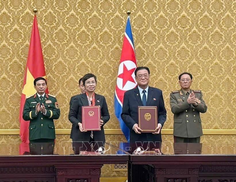 Tổng Giám đốc TTXVN Vũ Việt Trang và Chủ tịch KCNA Kim Pyong Ho ký Thỏa thuận hợp tác (10/10/20025). Ảnh: Hồng Điệp - TTXVN