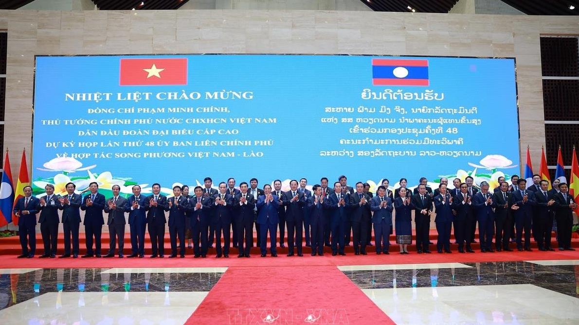 Thủ tướng Phạm Minh Chính và Thủ tướng Lào Sonexay Siphandone với thành viên đoàn hai nước tham dự Kỳ họp lần thứ 48 Ủy ban liên Chính phủ về hợp tác song phương Việt Nam-Lào (3/12/2025). Ảnh: Dương Giang-TTXVN