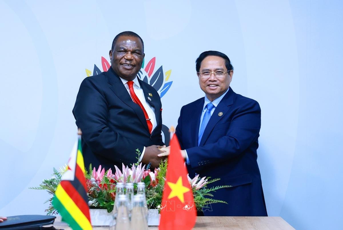 Tại cuộc gặp, Thủ tướng Phạm Minh Chính khẳng định Việt Nam luôn coi trọng phát triển quan hệ truyền thống với các quốc gia châu Phi, trong đó có Zimbabwe. Thủ tướng đề nghị hai bên cần tăng cường trao đổi đoàn các cấp, nhất là cấp cao; mở rộng thị trường xuất nhập khẩu, đẩy mạnh hợp tác trong các lĩnh vực giàu tiềm năng như nông nghiệp, viễn thông, 5G, khai thác khoáng sản, vật liệu xây dựng, dệt may, da giày. Thủ tướng cũng đề nghị hai bên sớm nghiên cứu ký kết Hiệp định Thương mại song phương, Hiệp định bảo hộ đầu tư, đồng thời mong muốn Zimbabwe ủng hộ Việt Nam triển khai đàm phán Hiệp định Thương mại Tự do (FTA) với Liên minh Thuế quan miền Nam châu Phi (SACU).
