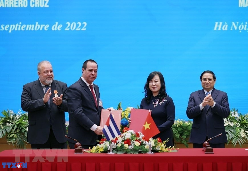 Thủ tướng Phạm Minh Chính và Thủ tướng nước Cộng hòa Cuba Manuel Marrero Cruz chứng kiến Lễ ký Kế hoạch hành động hợp tác y tế giữa Bộ Y tế hai nước (2022) (Ảnh: Dương Giang/TTXVN)