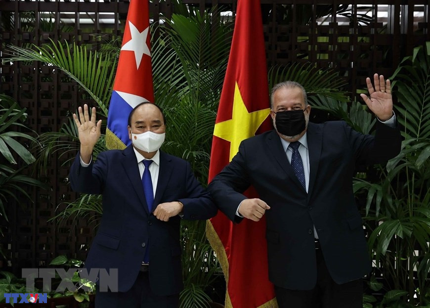 Chủ tịch nước Nguyễn Xuân Phúc hội kiến Thủ tướng Cộng hoà Cuba Manuel Marrero Cruz (19/9/2021). (Ảnh: Thống Nhất/TTXVN)