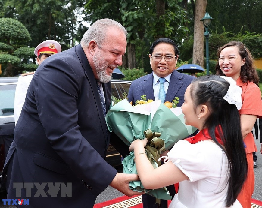 Thiếu nhi Thủ đô tặng hoa chào mừng Thủ tướng nước Cộng hòa Cuba Manuel Marrero Cruz thăm Việt Nam (29/9/2022). (Ảnh: Dương Giang/TTXVN)