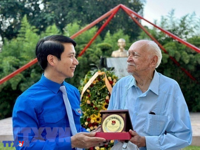 Chủ tịch TW Hội LHTN Việt Nam Nguyễn Ngọc Lương tặng quà lưu niệm kiến trúc sư Joel Diaz, Phó Chủ tịch Hội Hữu nghị Cuba - Việt Nam, người thiết kế công trình tượng đài Chủ tịch Hồ Chí Minh tại La Habana (Cuba). (Ảnh: Mai Phương/TTXVN)