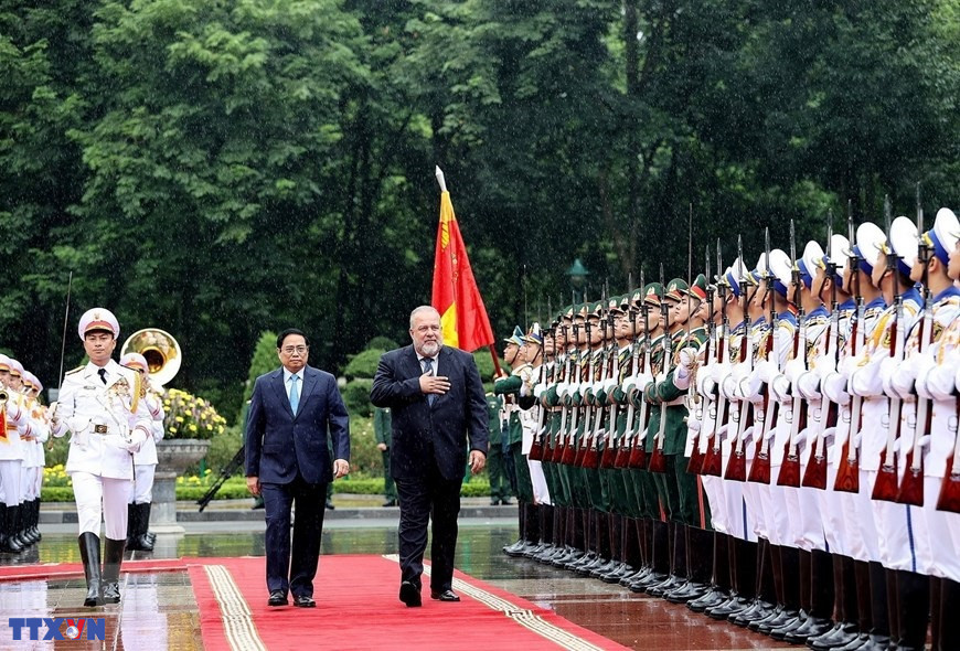 Thủ tướng Phạm Minh Chính và Thủ tướng nước Cộng hòa Cuba Manuel Marrero Cruz duyệt Đội danh dự Quân đội Nhân dân Việt Nam trong chuyến thăm chính thức Việt Nam (29/9/2022). (Ảnh: Dương Giang/TTXVN)