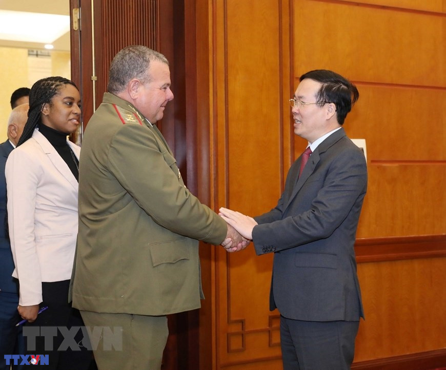 Thường trực Ban Bí thư Võ Văn Thưởng tiếp Chủ nhiệm Chính trị các Lực lượng vũ trang Cách mạng Cuba Victor Rojo Ramos thăm Việt Nam (7/12/2022). (Ảnh: Phương Hoa/TTXVN)