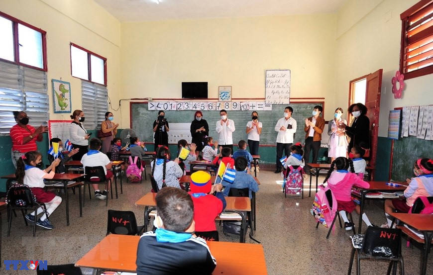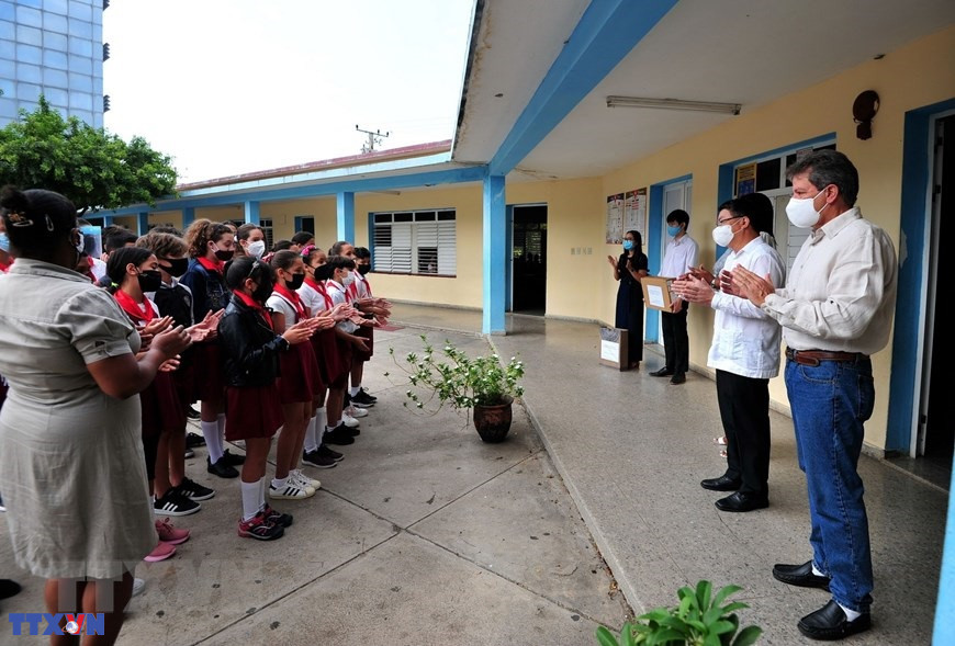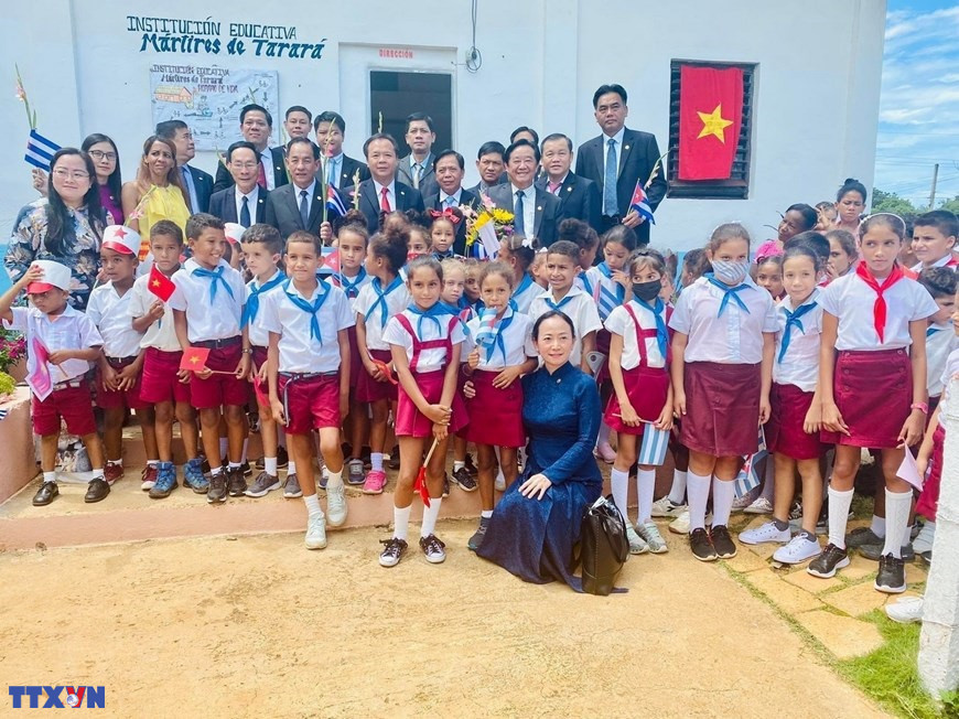 Đoàn công tác Đảng, chính quyền và doanh nghiệp tỉnh Bình Dương thăm trường tiểu học Mártires de Tarará (Những liệt sĩ vùng Tarará) và làng Bến Tre trong chuyến thăm và làm việc tại Cuba. (Ảnh: Mai Phương/TTXVN)