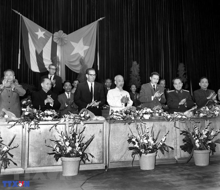 Chủ tịch Hồ Chí Minh cùng các vị lãnh đạo cấp cao Việt Nam tham dự lễ mittinh của hơn 1000 đại biểu các tầng lớp nhân dân thủ đô Hà Nội, chào mừng Đoàn đại biểu Đảng và Chính phủ Cách mạng Cuba, do Tổng thống Osvaldo Dorticós Torrado dẫn đầu sang thăm Việt Nam, cuối tháng 10/1966. (Ảnh: Văn Lượng/TTXVN)