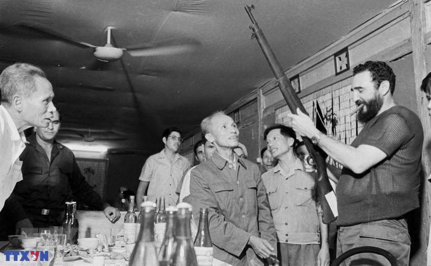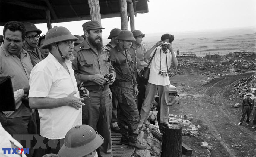 Ông Fidel Castro, Bí thư thứ nhất Ban Chấp hành Trung ương Đảng Cộng sản Cuba, Thủ tướng Chính phủ Cách mạng Cuba thị sát Căn cứ quân sự Tân Lâm-Dốc Miếu trên Hàng rào điện tử McNamara, bị quân và dân miền Nam phá hủy, ngày 15/9/1973. (Ảnh: TTXVN)