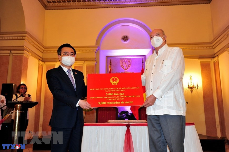 Bộ trưởng Bộ Xây dựng Nguyễn Thanh Nghị trao tượng trưng cho Bộ trưởng Ngoại thương và Đầu tư nước ngoài Cuba Rodrigo Malmierca Díaz món quà 5.000 tấn gạo của Nhà nước và nhân dân Việt Nam tặng nhân dân Cuba (2021). (Ảnh: Lê Hà/TTXVN)