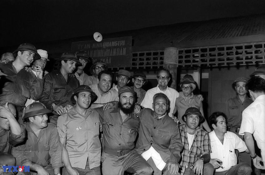 Ông Fidel Castro, Thủ tướng Chính phủ Cách mạng Cuba, Bí thư Thứ nhất BCH Trung ương Đảng Cộng sản Cuba cùng Đoàn đại biểu Đảng và Chính phủ Cách mạng Cuba chụp ảnh kỷ niệm bên đồn An ninh Nhân dân Bến Hải, địa cầu của miền Nam trong chuyến đến thăm vùng Giải phóng miền Nam Việt Nam, ngày 15/9/1973. (Ảnh: TTXVN)