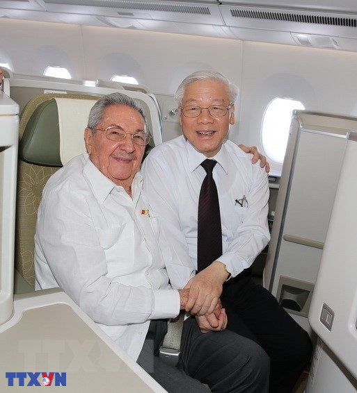 Tổng Bí thư Nguyễn Phú Trọng cùng ông Raul Castro Ruz, Bí thư thứ nhất BCH Trung ương Đảng Cộng sản Cuba, Chủ tịch Hội đồng Nhà nước và Hội đồng Bộ trưởng Cuba trên chuyên cơ Việt Nam đến thăm thành phố Santiago de Cuba, sáng 30/3/2018. (Ảnh: Trí Dũng/TTXVN)