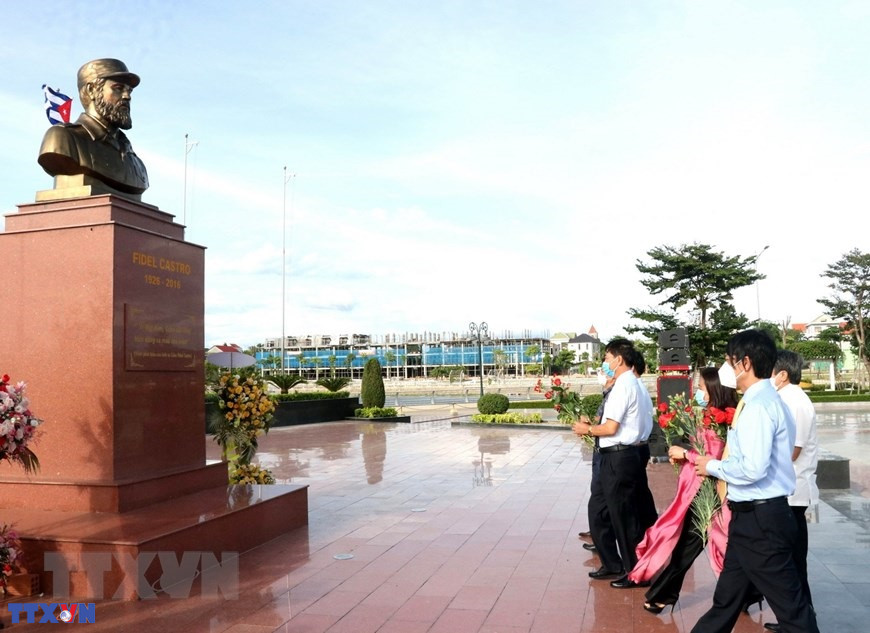 Lãnh đạo tỉnh Quảng Trị dâng hoa tưởng niệm Lãnh tụ Cuba Fidel Castro tại Công viên Fidel Castro ở thành phố Đông Hà nhân kỷ niệm 95 năm Ngày sinh của Ông (2021). (Ảnh: Nguyên Lý/TTXVN)