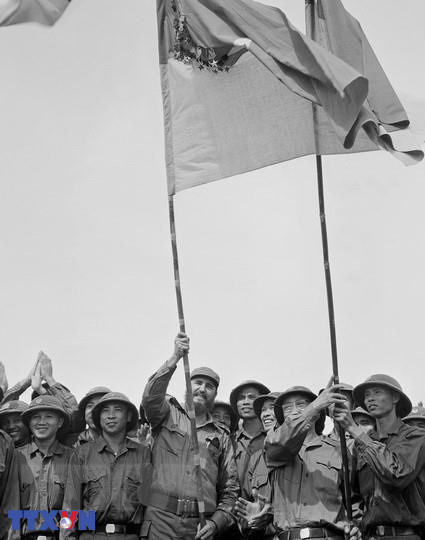 Bí thư thứ nhất Ban Chấp hành Trung ương Đảng Cộng sản Cuba, Thủ tướng Chính phủ Cách mạng Cuba Fidel Castro phất cao lá cờ truyền thống của Đoàn Khe Sanh, Quân giải phóng Trị Thiên-Huế, ngày 15/9/1973. (Ảnh: TTXVN)