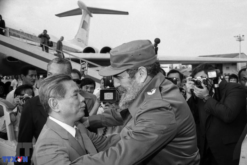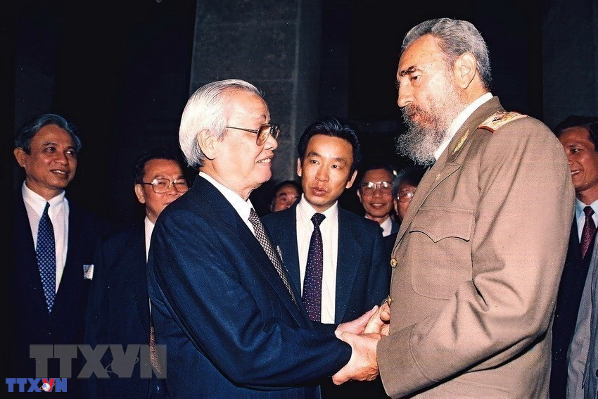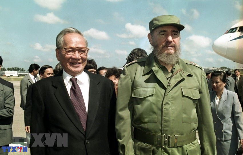 Ông Fidel Castro, Bí thư thứ nhất BCH TW Đảng Cộng sản Cuba, Chủ tịch HĐNN, Chủ tịch HĐBT nước Cộng hòa Cuba đón Tổng Bí thư Nguyễn Văn Linh tại sân bay Jose Marti trong chuyến thăm hữu nghị chính thức Cuba từ ngày 24-29/4/1989. (Ảnh: Xuân Lâm/TTXVN)