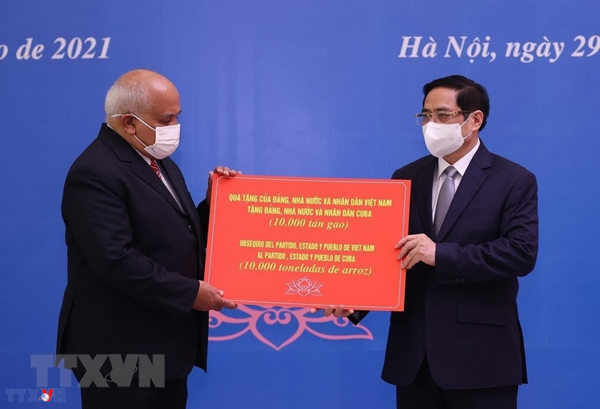 Thủ tướng Phạm Minh Chính trao 10.000 tấn gạo của Đảng, Nhà nước và nhân dân Việt Nam tặng Đảng, Nhà nước và nhân dân Cuba qua Đại sứ Cuba Orlando Nicolás Hernández Guillén (2021). (Ảnh: TTXVN)