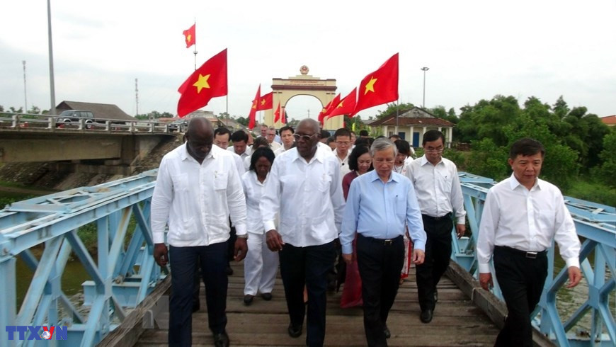 Đoàn đại biểu cấp cao Đảng, Nhà nước Cuba và các đồng chí lãnh đạo Đảng, Nhà nước, lãnh đạo tỉnh Quảng Trị tham quan và cùng đi qua cây cầu Hiền Lương lịch sử, nơi lãnh tụ Fidel Castro từng đến vào năm 1973. (Ảnh: Trịnh Bang Nhiệm/TTXVN)