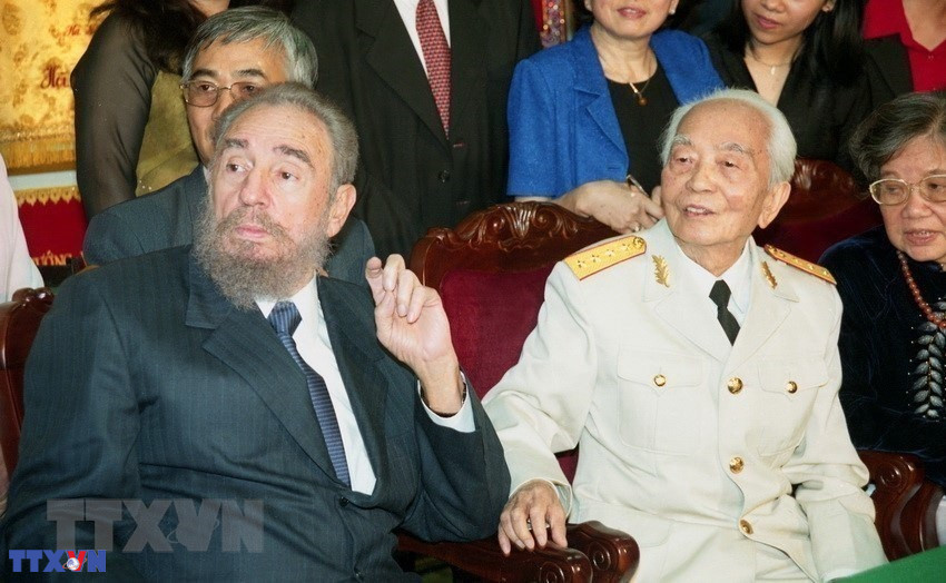 Ngày 22/2/2009, ông Fidel Castro, Bí thư thứ nhất BCH Trung ương Đảng Cộng sản Cuba, Chủ tịch HĐNN và Chính phủ Cuba hội kiến Đại tướng Võ Nguyên Giáp tại tư dinh của Đại tướng, nhân chuyến thăm hữu nghị chính thức Việt Nam. (Ảnh: Nhan Sáng/TTXVN)