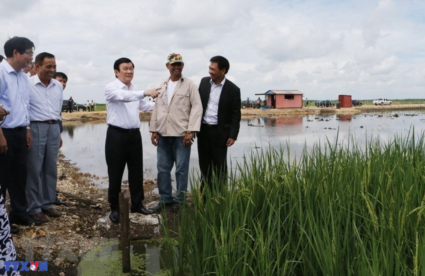 Trong chuyến thăm hữu nghị chính thức Cuba, Chủ tịch nước Trương Tấn Sang thăm Dự án sản xuất lúa gạo Calimete ở tỉnh Matanzas (30/9/2015). (Ảnh: Nguyễn Khang/TTXVN)